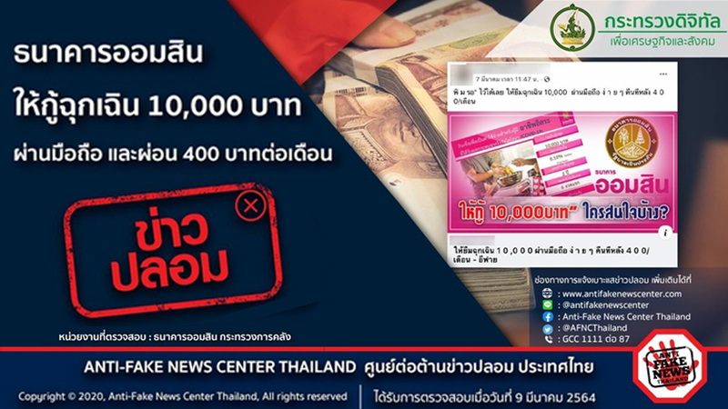 The Digital Economy and Society Ministry has warned people against believing or sharing news and Internet posts claiming that the Government Savings Bank (GSB) has launched a new emergency personal loan of Bt10,000 per person, in which applicants must register via their mobile phones and repay at Bt400 per month.