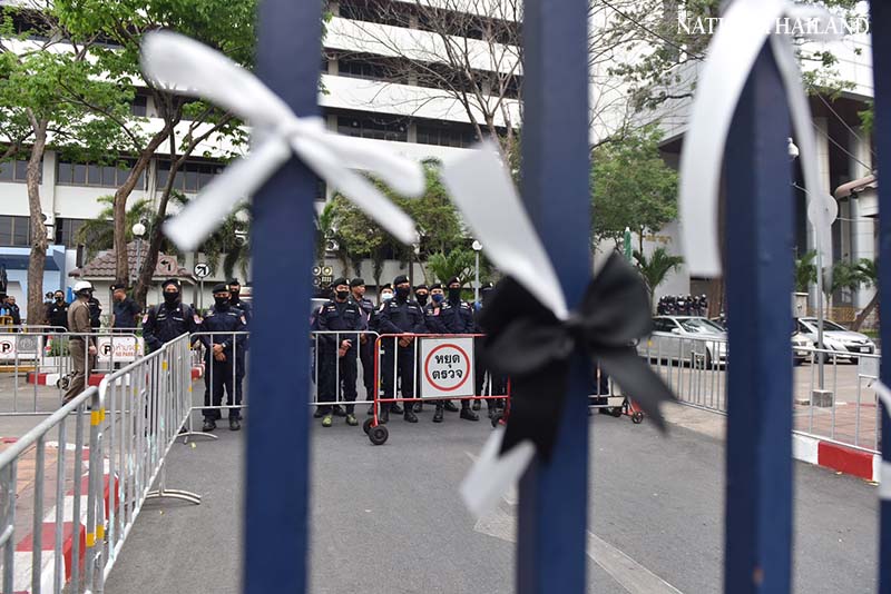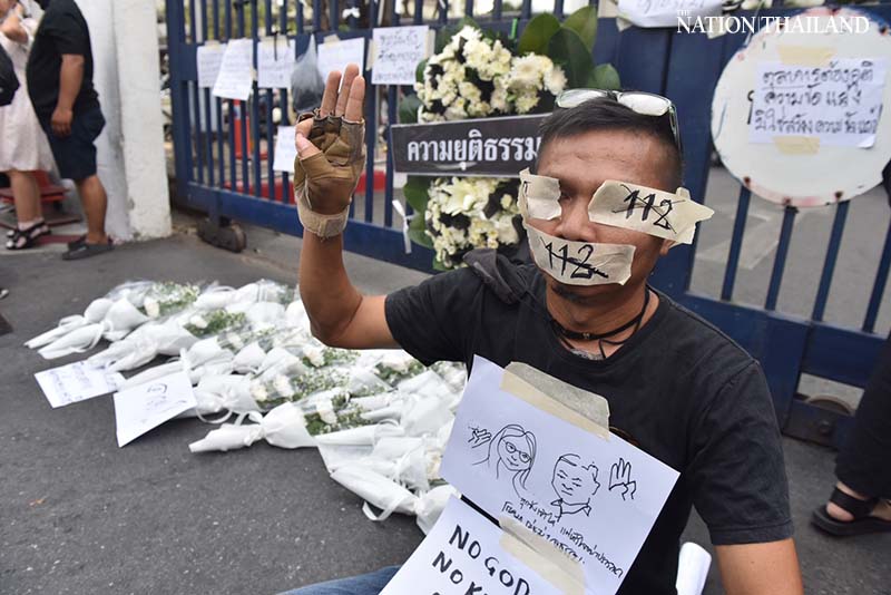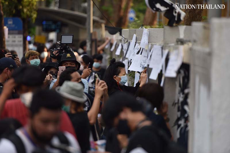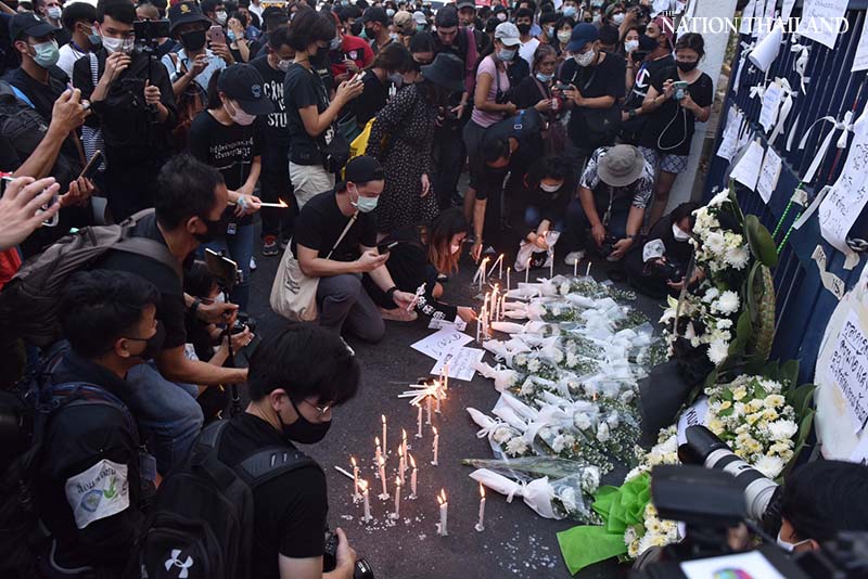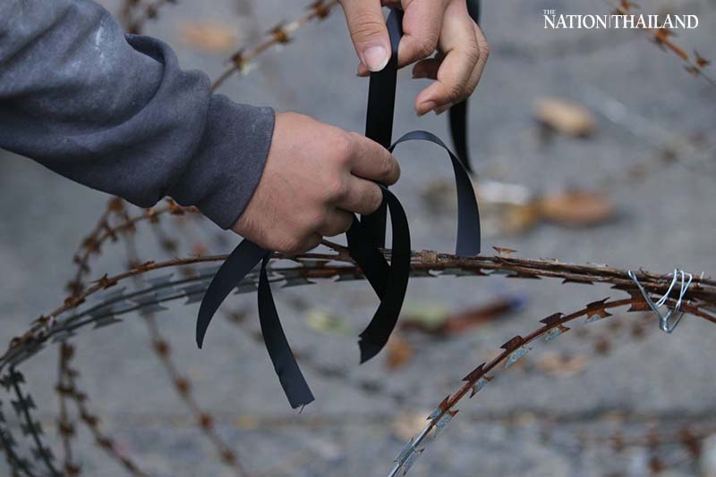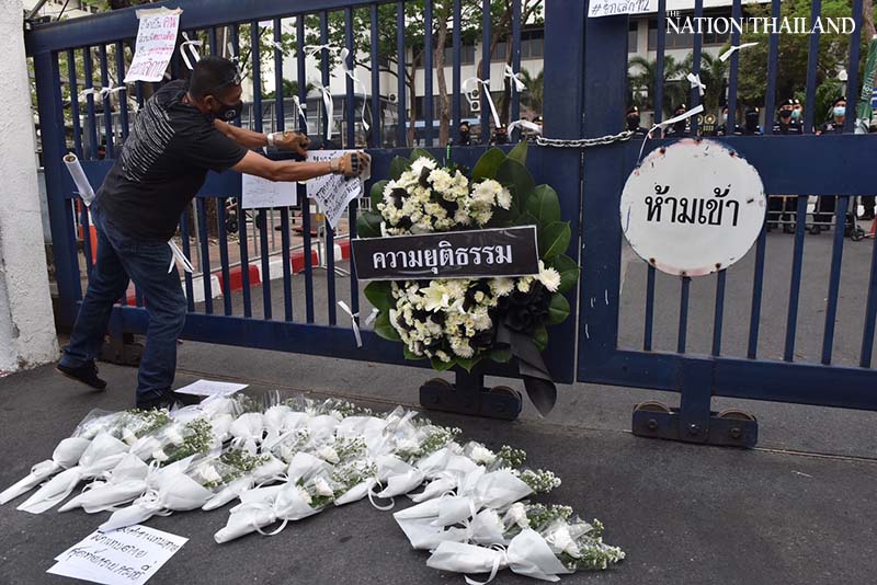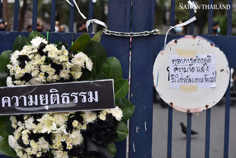In response, black-clad protesters from the United Front of Thammasat and Demonstration group gathered outside the Criminal Court, where they laid a wreath and tied ribbons and messages to the fence.