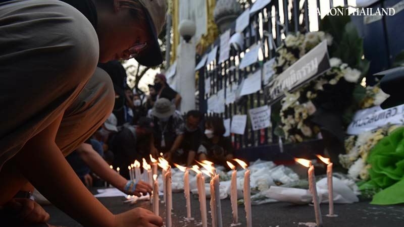 In response, black-clad protesters from the United Front of Thammasat and Demonstration group gathered outside the Criminal Court, where they laid a wreath and tied ribbons and messages to the fence.