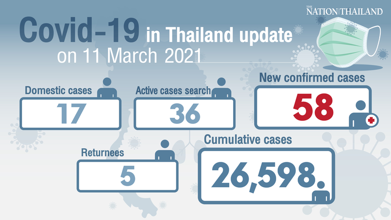 The Centre for Covid-19 Situation Administration (CCSA) on Thursday reported 58 new cases, four of whom are returnees and one an illegal migrant arrested at the Thai-Myanmar border.