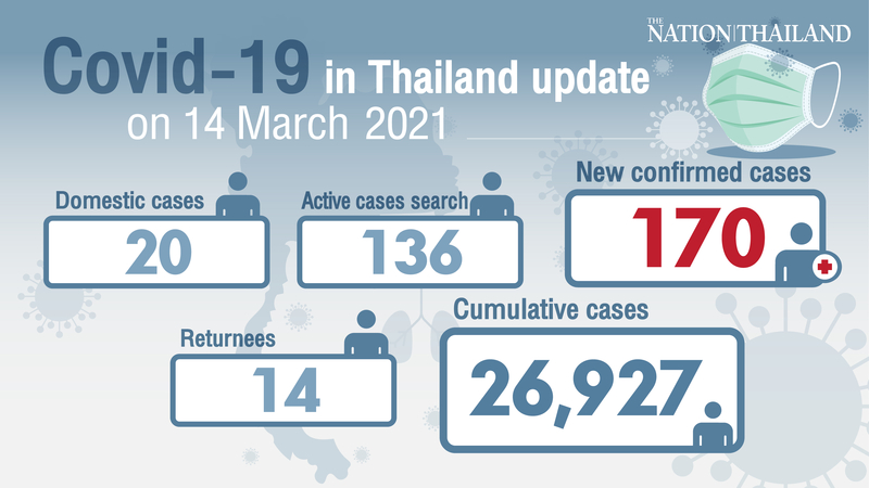 The Centre for Covid-19 Situation Administration (CCSA) on Sunday reported 170 new cases, including 13 overseas travellers in quarantine facilities and one found to have sneaked in from the Thai-Malaysia border.
