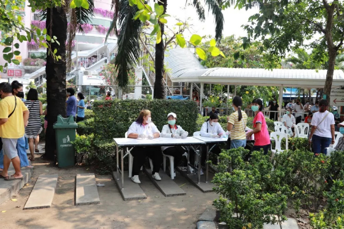 A Bang Khae public health officer said: “The registration for testing started at 7.30am. Don’t forget to bring you ID card and mobile phone to scan a QR Code for symptom monitoring application that you should use for 14 days after testing. If you are found to be infected, officials will send an alert to your phone within 1-2 days and will later send an instruction to get treatment.”