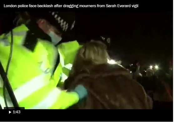 On Saturday, police broke up a vigil-turned-protest in south London by people mourning Everard, 33, who was last seen walking home on March 3 and whose remains were found in a large bag last week.