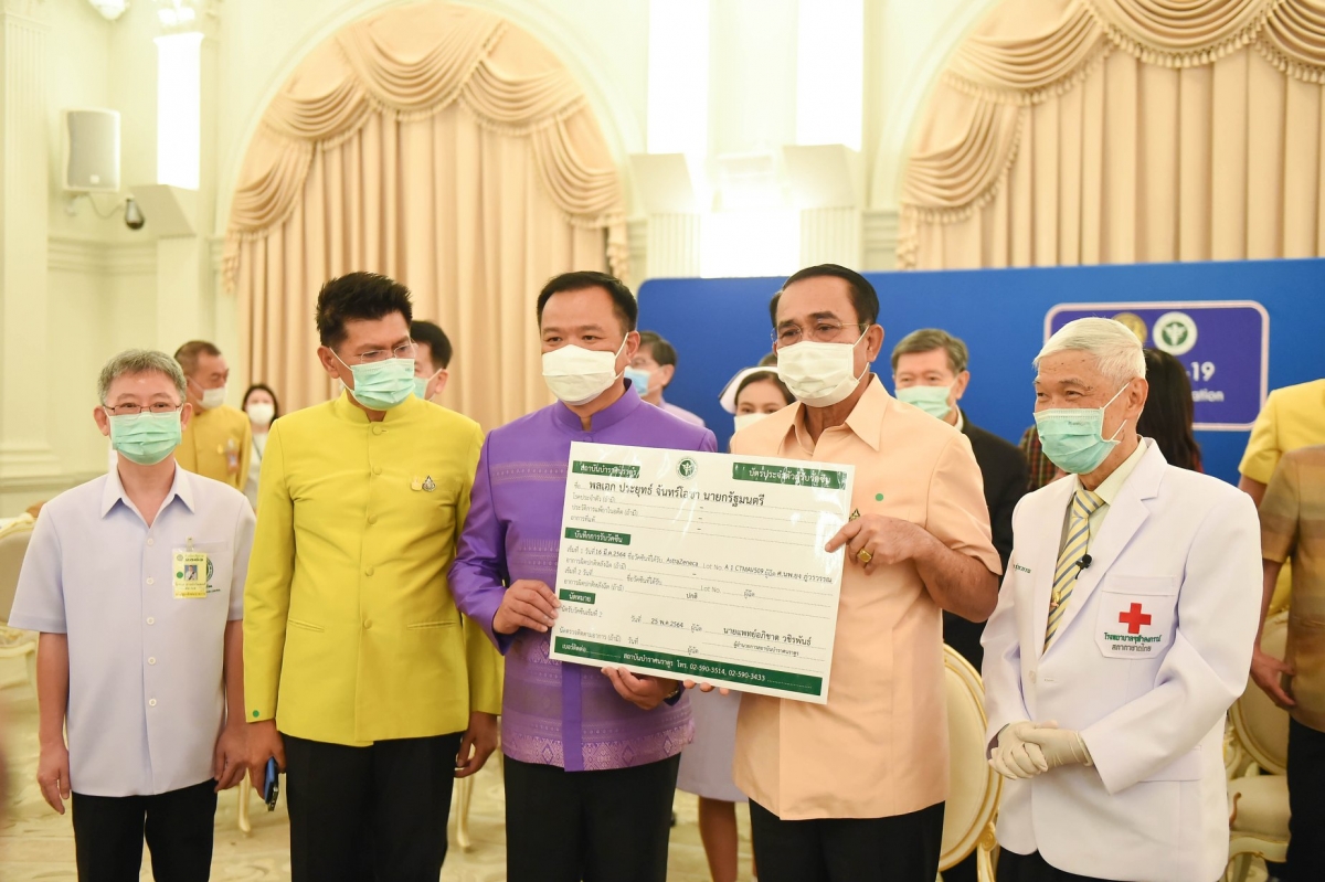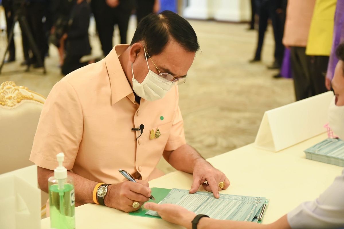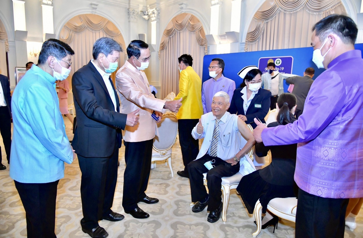 Prime Minister General Prayut Chan-o-cha and 15 ministers received the AstraZeneca Covid-19 vaccine at Santi Maitree Building in the Government House complex before a Cabinet meeting on Tuesday.