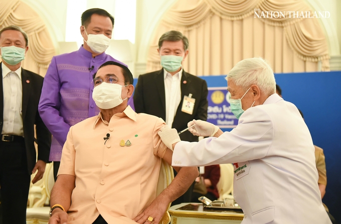 Prime Minister General Prayut Chan-o-cha and 15 ministers received the AstraZeneca Covid-19 vaccine at Santi Maitree Building in the Government House complex before a Cabinet meeting on Tuesday.