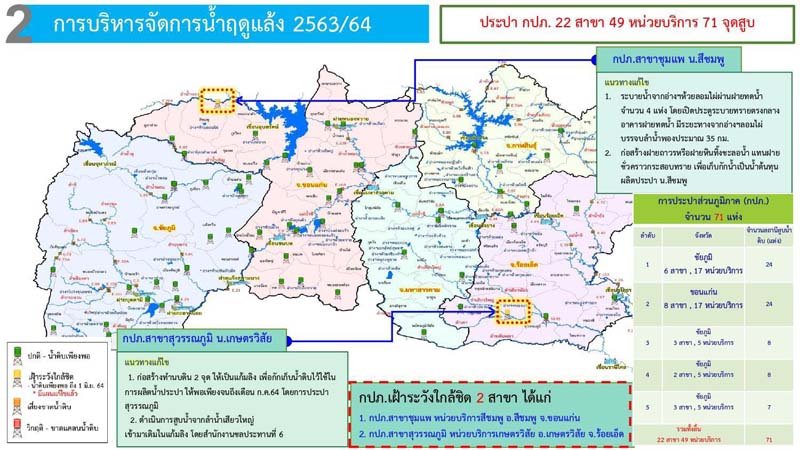 ทั้งนี้ กรมชลประทาน ได้ทำการประเมินพื้นที่ต่างๆ ที่มีความเสี่ยงต่อการขาดแคลนน้ำดิบสำหรับสนับสนุนการผลิตน้ำประปา โดยศูนย์ปฏิบัติการน้ำอัจฉริยะ (SWOC) กรมชลประทาน ได้สั่งการไปยังศูนย์ปฏิบัติการน้ำอัจฉริยะทั่วประเทศทำการรวบรวมข้อมูลดังกล่าว เพื่อวิเคราะห์ข้อมูลและหาแนวทางแก้ไขปัญหาให้ตรงกับความต้องการของพี่น้องประชาชนในแต่ละพื้นที่ อาทิ ในพื้นที่อีสานกลาง 5 จังหวัด (ขอนแก่น ชัยภูมิ กาฬสินธุ์ มหาสารคาม และร้อยเอ็ด) มีจำนวนแม่ข่ายของการประปาส่วนภูมิภาคทั้งหมด 22 สาขา 49 หน่วยบริการ 71 สถานีสูบน้ำดิบ ซึ่งใช้น้ำดิบในเขตชลประทาน 44 แห่ง และนอกเขตชลประทาน 27 แห่ง พบว่ามีการประปาฯ 2 สาขาที่ต้องเฝ้าระวัง ได้แก่ การประปาส่วนภูมิภาคสาขาชุมแพ หน่วยบริการอำเภอสีชมพู จังหวัดขอนแก่น (นอกเขตชลประทาน) และการประปาส่วนภูมิภาคสาขาสุวรรณภูมิ หน่วยบริการเกษตรวิสัย จังหวัดร้อยเอ็ด (ในเขตชลประทาน)