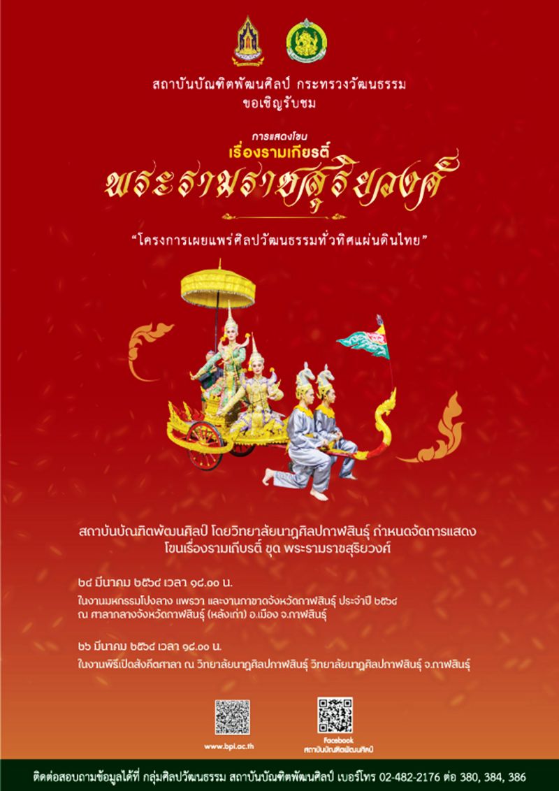 เพื่อให้ประชาชนทุกภูมิภาคทั่วประเทศได้มีโอกาสชมการแสดงโขนอันเป็นมรดกทางวัฒนธรรมของชาติไทย กระทรวงวัฒนธรรม โดยสถาบันบัณฑิตพัฒนศิลป์ เชิญชวนประชาชนชาวไทย ชมการแสดงโขนกลางแจ้ง เรื่องรามเกียรติ์ชุดพระรามราชสุริยวงศ์ โดยนักแสดงจากวิทยาลัยนาฏศิลปกาฬสินธุ์ซึ่งจะจัดแสดง ๒ ครั้งครั้งแรกในงานมหกรรมโปงลาง แพรวา และงานกาชาดจังหวัดกาฬสินธุ์ ประจำปี ๒๕๖๔ งานเทศกาลประจำปีครั้งยิ่งใหญ่ที่รวมรวบของดีเมืองกาฬสินธุ์มาไว้ในงานเดียวในวันพุธที่ ๒๔ มีนาคมนี้ เวลา๑๘.๐๐น.ณ ศาลากลางจังหวัดกาฬสินธุ์ (หลังเก่า) อ.เมือง จ.กาฬสินธุ์และจัดแสดงอีกครั้งในงาน “พิธีเปิดสังคีตศาลาวิทยาลัยนาฏศิลปกาฬสินธุ์”ในวันศุกร์ที่ ๒๖ มีนาคม ๒๕๖๔เวลา ๑๘.๐๐ น.ณ วิทยาลัยนาฏศิลปกาฬสินธุ์ จ.กาฬสินธุ์