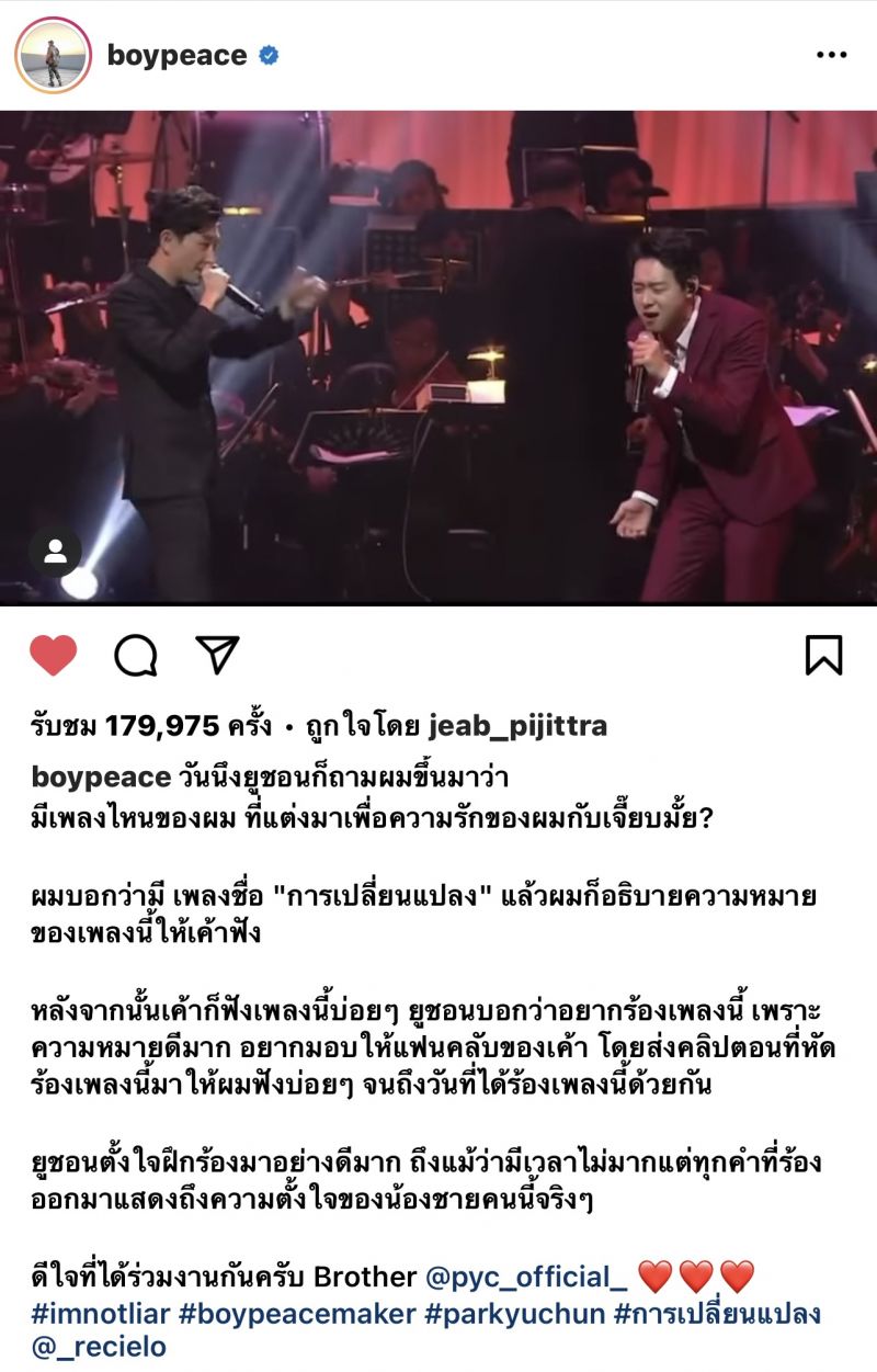 ทุกคำที่เขียนคัดกรองมาจากความรู้สึก ถึงขั้นหวานจนน้ำตาลเรียกพี่เลยทีเดียว กับโพสต์ล่าสุดของนักร้องหนุ่ม บอย พีซเมคเกอร์ หลังจากที่ได้ไปเป็นแขกรับเชิญคนพิเศษในมินิคอนเสิร์ตของน้องชายสุดเลิฟ ยูชอน ก่อนที่จะบินกลับไปยังประเทศเกาหลีที่ผ่านมาแล้วนั้น หนุ่มบอย ได้มาบรรยายถึงความรู้สึกผ่านอินสตราแกรมส่วนตัวถึงเพลง การเปลี่ยนแปลง ซึ่งเป็นเพลงที่ บอย ได้ร่วมร้องกับ ยูชอน ในมินิคอนเสิร์ต ซึ่งเจ้าตัวได้เผยว่าสำหรับเพลงนี้พิเศษมากสำหรับตัวเองจริงๆเพราะเป็นเพลงที่แต่งมาเพื่อความรักของผมกับเจี๊ยบ …