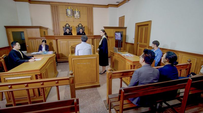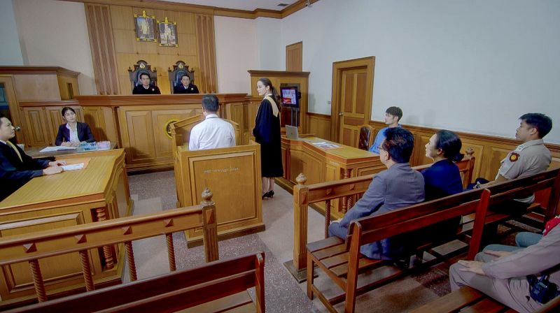 เรายกกองไปถ่ายทำกันที่ศาลจริงๆ โดยมีเจ้าหน้าที่ของศาลคอยให้คำปรึกษาและดูแลอย่างใกล้ชิด งานหนักตกที่จีน่า เพราะปกติธรรมดาบทพูดก็ยากอยู่แล้ว แต่งานนี้ต้องพูดเป็นภาษาทนายความ แถมยังเป็นทนายความที่ฉลาดและฟาดสุดๆ จีน่าต้องยกมือขอผู้ช่วยผู้กำกับฯ นั่งทวนบทกันยกใหญ่ ส่วนพี่บอยนั้นเหมือนจะชิลแต่ไม่ชิล เพราะแม้ไม่มีบทพูดแต่ต้องถ่ายทอดอารมณ์ผ่านสายตาแบบสุดๆ เพื่อช่วยส่งอารมณ์ให้จีน่าพาตัวเองให้รอดคุกให้ได้ (5555) เมื่อจีน่าซักซ้อมบทจนเข้าปากดีแล้ว พี่แอ้ว ผู้กำกับฯ ก็เรียกมาบรีฟทันที ฉากนี้พี่แอ้วต้องการให้จีน่าฉะฉานที่สุด ฟาดที่สุด มั่นใจที่สุด เมื่อซ้อมกันจนมั่นใจแล้วก็เริ่มเอาจริง ทันทีที่นับ 5 4 3 2 จีน่าก็เริ่มสวมบทบาททนายปลายฝน ส่งสายตามุ่งมั่นให้ไปถึงผู้พิพากษา แต่อุปสรรคของฉากนี้คือ “บทยากและยาวมาก” ไม่ว่าเก่งแค่ไหนยังไงก็ต้องหลายเทคกับบทเกือบสองหน้ากระดาษเอสี่ แถมยังเป็นภาษาอาชีพที่จีน่าไม่เคยสัมผัส บวกกับบรรยากาศในศาล และความกดดันต่างๆ ทำเอาจีน่าเหงื่อแตกไปหลายรอบ พี่แอ้วประกาศเลยว่า ฉากนี้ต้องทำทุกอย่างให้ถูกต้องและสมจริงที่สุด งานนี้เลยต้องมีพี่เจ้าหน้าที่ช่วยดูตลอดว่าติดขัดตรงไหนไหม พูดถูกหรือเปล่า? ขั้นตอนเป็นยังไง? เพื่อให้ฉากนี้ออกมาสมบูรณ์แบบอย่างพี่แอ้วต้องการ และความยากนี้เองที่กดดันจนจีน่าต้องเทคไปหลายครั้ง จนพี่บอยต้องส่งกำลังใจให้น้องแบบรัวๆ ส่วนเจ้าตัวก็พร้อมสู้เต็มที่! ก่อนจะรวบรวมสติและพลังใหม่อีกครั้งแล้วสวมวิญญาณทนายสาวจบใหม่ไฟแรง ฟาดโช๊ะๆ งานนี้ไดอะล็อคมาแบบปังๆ สื่อสารกับผู้พิพากษา สื่อสารกับพยาน แถมยังโชว์หลักฐานแบบมั่นใจสุดๆ รอบนี้ไม่มีติดขัด จนพี่แอ้วถึงกับตบเข่าฉาด ว่า “มันต้องอย่างนี้สิ!” และในที่สุดคำว่า “ผ่านค่ะ” ก็ออกมาจากปากพี่แอ้ว จีน่ายิ้มออกทันที พร้อมโอดครวญว่าชีวิตนี้เธอคงเป็นทนายความไม่ได้แน่นอน เพราะภาษากฎหมายมันยากเกินใจเธอจริงๆ !