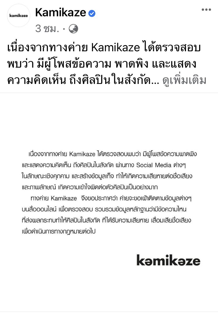 “เนื่องจากทางค่าย Kamikaze ได้ตรวจสอบพบว่า มีผู้โพสต์ข้อความ พาดพิง และแสดงความคิดเห็น ถึงศิลปินในสังกัด ผ่านทาง Social Media ต่างๆ ในลักษณะเชิงคุกคาม และสร้างข้อมูลเท็จ ทำให้เกิดความเสียหายต่อชื่อเสียง และภาพลักษณ์ เกิดความเข้าใจผิดต่อตัวศิลปินเป็นอย่างมาก