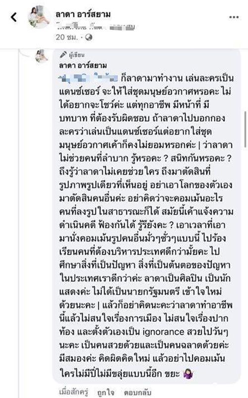 “ไม่รู้ว่าชีวิตเป็นอะไร เราจะต้องมาเจออะไรแบบนี้ตลอดเวลา เรื่องของเรื่องคือเมื่อวานเราไปถ่ายละครเรื่องกระสือลำซิ่ง แล้วมันเป็นวันแรกเลยที่เราฟิตติ้งชุดแดนเซอร์ ในเรื่องเราเล่นเป็นโดนัทที่เป็นแดนเซอร์ ชุดจะเป็นเกาะอก กางเกงขาสั้นข้างในแต่คนอื่นอาจจะไม่รู้ว่ามีถุงน่อง แต่เรารู้ เราก็เซฟตัวเราเอง แล้วคุณแม่ก็เป็นคนถ่ายรูปลงเพจ ลาดา อาร์สยามตามปกติอัพเดตให้แฟนคลับดู แต่ลาดาไม่ได้เห็นหรอก เพราะว่าเมื่อวานถ่ายละครทั้งวัน พอตื่นเช้าขึ้นมาวันนี้ คุณแม่ก็บอกว่า มีคนเข้ามาคอมเมนต์แปลกๆ เข้าไปดูสิ เราก็เข้าไปอ่าน อ่านอยู่ 2 รอบ ว่าเขาจะสื่ออะไร ใจความก็จะประมาณว่า “คนเขาไม่อยากดูรูปหรอกคนสวย เขาอยากให้โชว์ด้านดีๆ เพื่อสังคม คนไทยสับสนไปหมดแล้ว ทำไมไม่ไปช่วยเหลือคนอื่น” อะไรประมาณนี้“ทำไมต้องมาโชว์ ไม่มีใครเขาอยากดูหรอกค่ะ”เราก็นึกๆ อยู่ว่า เขาจะให้เราโชว์อะไรเพื่อสังคมก็บอกกับคุณแม่ว่า คนแบบนี้ต้องตอบกลับไป ไม่งั้นคนแบบนี้เขาจะไม่รู้ว่าสิ่งที่เขาคิด มันไม่ใช่ ก็เลยตอบว่า “เรารับบทแดนเซอร์นะ ชุดเนี้ยก็เป็นชุดในการทำงาน เราไม่ได้มีหน้าที่ที่จะต้องไปแก้ไขปัญหาสังคมอะไรในประเทศไทย” แต่คอมเมนต์นี้โพสต์มาไม่ถึง 5 นาทีเขาก็ลบไป แต่เราแคปไว้แล้ว คือเราไม่ได้รู้สึกว่าเจ็บ หรืออะไร เรารู้สึกว่าเราก็สามารถเป็นส่วนหนึ่งในการทำให้ประเทศไทยดีขึ้นได้เพราะเราก็เป็นคนไทย เราก็ทำหน้าที่ของเราให้ดี แต่ปกติเวลาเราลงรูปเราจะสแกนความเหมาะสมตลอดอยู่แล้ว ก็ไม่ได้รู้สึกโกรธหรืออะไร ก็แค่บอกเขาว่าเอาเวลาไปทำอย่างอื่นเถอะ”