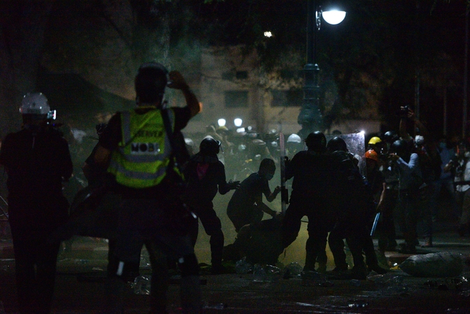 7.35pm: Crowd control officers come out from behind the containers and take control of the situation, seizing the area and arresting some of the protesters.