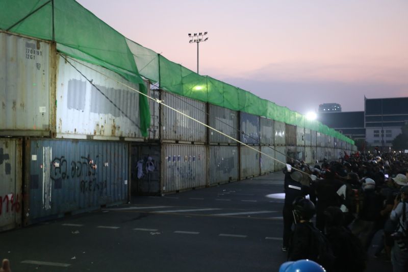 7.53pm: Crowd control staff expand the barrier to fix the force around Sanam Luang, ordering all unrelated parties to leave the area, blocking entry to the assembly area in Sanam Luang.