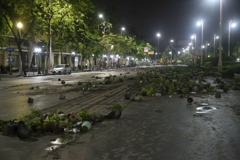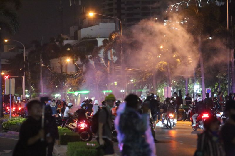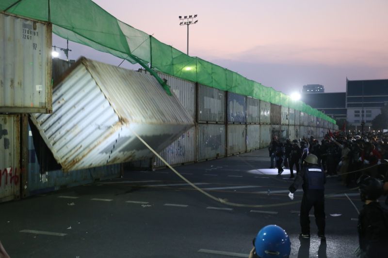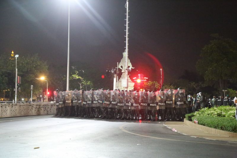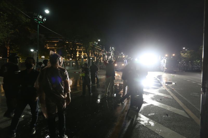 9pm: At the Khok Wua intersection, a fire is lit to burn the plant pots on the outbound side of Rajdamnoen Road. There are also occasional firecracker sounds. As police officers guard the middle of Rajdamnoen Road and continue to restore the area, rubber bullets and tear gas are fired. At least five protesters are arrested and interrogated.