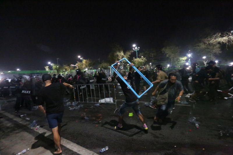 Pro-democracy protesters and police clashed at Sanam Luang on Saturday night, leaving 32 people injured.