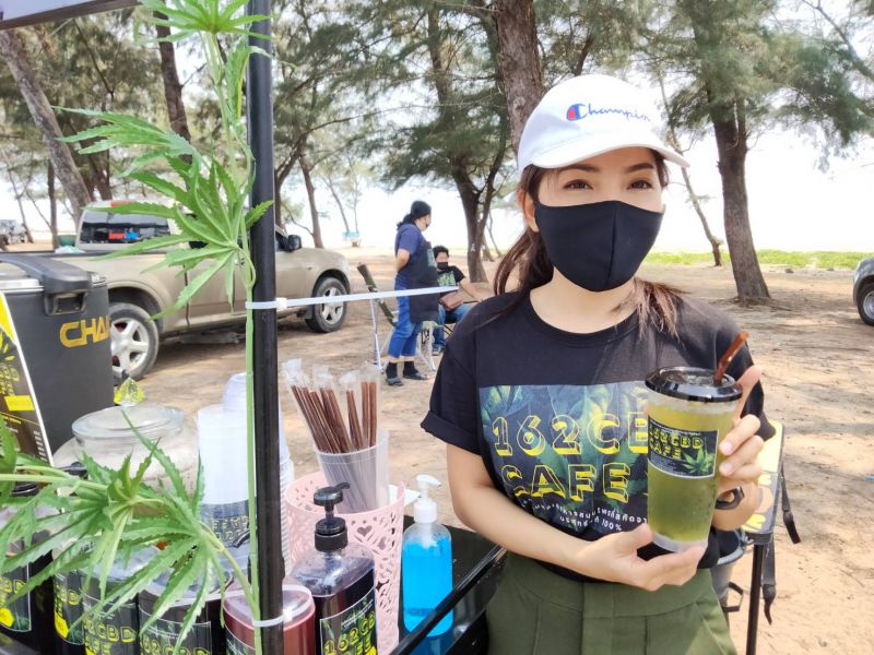 นางสาวสายป่าน กีรณา เจ้าของร้านเครื่องดื่มอารมณ์ดี บอกว่าตนเองมีงานประจำเป็นเซลขายรถ พอมีเวลาว่าง ก็มาขายเครื่องดื่มผสมกัญชาที่ชายหาดเพราะเห็นว่ากระแสกัญชากำลังมาแรง มีลูกค้ามาอุดหนุนเป็นจำนวนมาก เพราะดื่มแล้วผ่อนคลายให้ความสดชื่น ซึ่งเครื่องดื่มทุกแก้ว ไม่เพียงผสมใบกัญชาในน้ำชงที่มีให้เลือกหลายรสชาติเท่านั้น แต่จะใส่ใบกัญชาต้มเข้าไปในแก้ว เพื่อให้ลูกค้าได้สัมผัสกับรสชาติของใบกัญชาอย่างแท้จริง