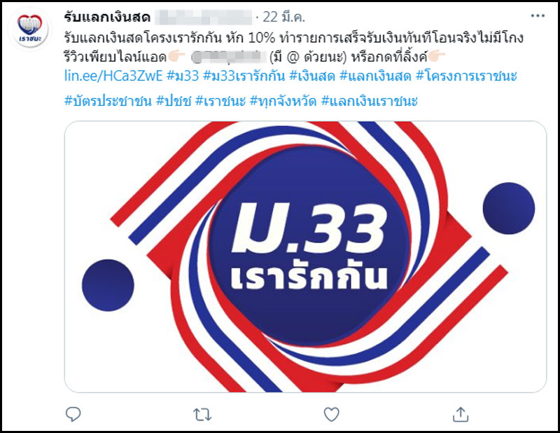 ล่าสุด มีรายงานว่า บนเว็บไซต์ทวิตเตอร์ชื่อ รับแลกเงินสด พบว่ามีการเปิดช่องทางให้แลกเงิน ม.33 เรารักกัน โดยเปิดให้ผู้ได้สิทธิโครงการ ม.33 เรารักกัน นำสิทธิมาแลกเป็นเงินสด หักเงินค่าบริการ 100 บาท จากที่ได้รับผ่านแอพพลิเคชั่นเป๋าตัง