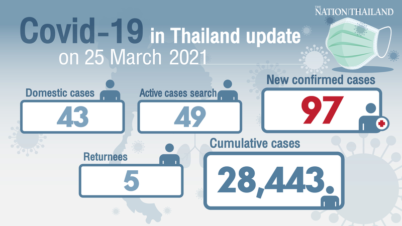 Of the overseas travellers, three Thais and one American in quarantine facilities were found to be infected. One Thai, who was arrested on March 19 for illegally crossing the Thai-Malaysia border, was infected on March 22 and sent to Wang hospital.