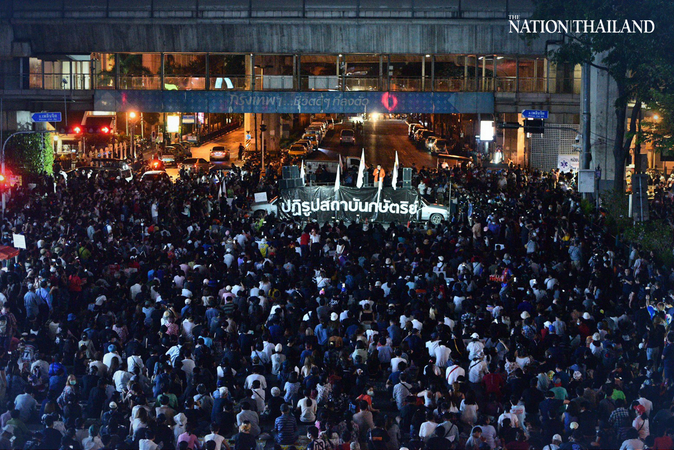 The United Front of Thammasat and Demonstration group held the rally from 5.30pm, with the gathering stretching from Rajdamri Road to Big C shopping centre.