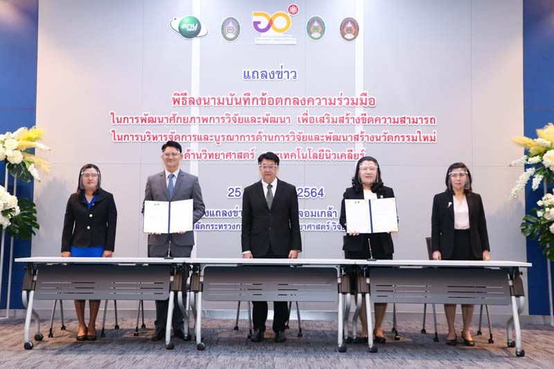 25 มี.ค.64 รศ.ดร.พาสิทธิ์ หล่อธีรพงศ์ ที่ปรึกษาด้านวิทยาศาสตร์และเทคโนโลยี กระทรวงการอุดมศึกษา วิทยาศาสตร์ วิจัยและนวัตกรรม เป็นประธานใน “พิธีลงนามบันทึกข้อตกลงความร่วมมือในการพัฒนาศักยภาพการวิจัยและพัฒนา เพื่อเสริมสร้างขีดความสามารถในการบริหารจัดการและบูรณาการ ด้านการวิจัยและพัฒนา สร้างนวัตกรรมใหม่ด้านวิทยาศาสตร์ และเทคโนโลยีนิวเคลียร์” ซึ่งสถาบันเทคโนโลยีนิวเคลียร์แห่งชาติ (สทน.) จัดขึ้น ภายใต้โครงการ “การสร้างมูลค่าให้กับอาหารพื้นถิ่นด้วยการฉายรังสี” และ “โครงการคูปองยกระดับผลิตภัณฑ์ด้วยนวัตกรรมฉายรังสี” โดยมี รศ.ดร.ธวัชชัย อ่อนจันทร์ ผู้อำนวยการ สทน. และอธิการบดีมหาวิทยาลัยราชภัฏ 3 แห่ง ได้แก่ มรภ.ราชนครินทร์ มรภ.พระนครศรีอยุธยา และมรภ.ธนบุรี พร้อมด้วยคณะผู้บริหาร มรภ. และ สทน. ร่วมงาน ณ อาคารพระจอมเกล้า ชั้น 1 สำนักงานปลัดกระทรวงฯ