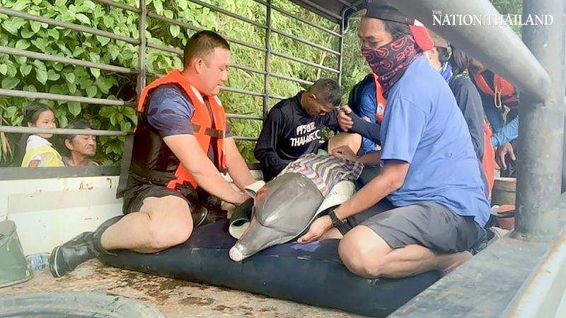 Officials tried to corner the dolphin by casting a fishing net and successfully caught it after around one hour. The dolphin was then brought to Trat Navy Supply Base in Laem Ngob district for a health examination by veterinarians.