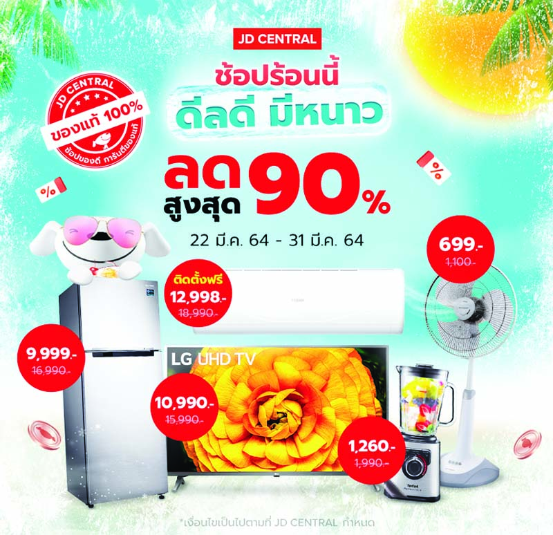 JD CENTRAL ชวนช็อปเครื่องใช้ไฟฟ้าแบรนด์แท้ 100% ลดสูงสุด 90% พร้อมรับคูปองรวมกว่า 2,000 บาท ถึง 31 มี.ค. ติดตามทาง Facebook : JD CENTRAL หรือ LINE OFFICIAL ACCOUNT : JD CENTRAL
