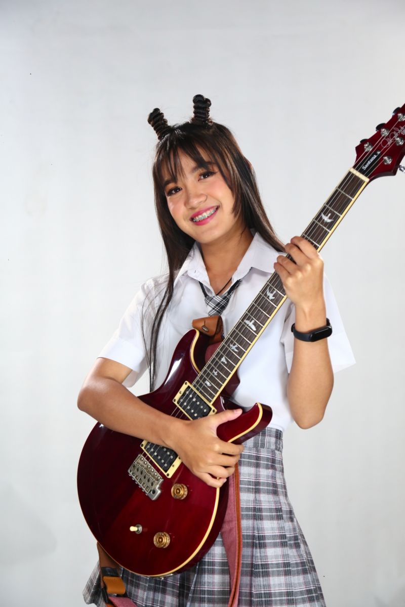 – การ์ตูน นางสาว มัณธิตา อายุ 17 ปี เล่นกีตาร์ริทึ่ม อายุ 17 ปี สวย ยิ้มเก่ง ร่าเริงตลอดเวลา ที่ใช้กีต้าร์สืออารมณ์ของตัวเองออกมา