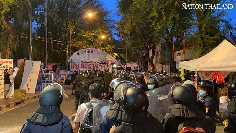 Protection and crowd control police arrested pro-democracy protesters camped on Bangkok’s Rama V Road near Government House on Sunday morning.