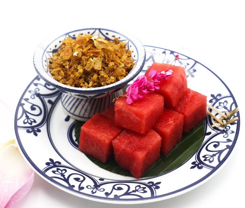 “ปลาแห้งแตงโม” Dried fish and crispy shallot with watermelon แตงโมรสหวาน เย็นฉ่ำ ชื่นใจรับประทานคู่กับปลาแห้งที่ปรุงด้วยสูตรเฉพาะของปาร์คนายเลิศปลาแห้งแตงโม เมนูอาหารไทยโบราณที่มีมาตั้งแต่สมัยรัชกาลที่ 4 ที่คนโบราณนิยมรับประทานเป็นอาหารว่างยามบ่ายในช่วงหน้าร้อน เพราะแตงโมนั้นมีสรรพคุณช่วยดับกระหาย ยิ่งแช่เย็นๆ เมื่อรับประทานก็ยิ่งชุ่มคอ คลายร้อนได้ดีทีเดียว ราคา 190++