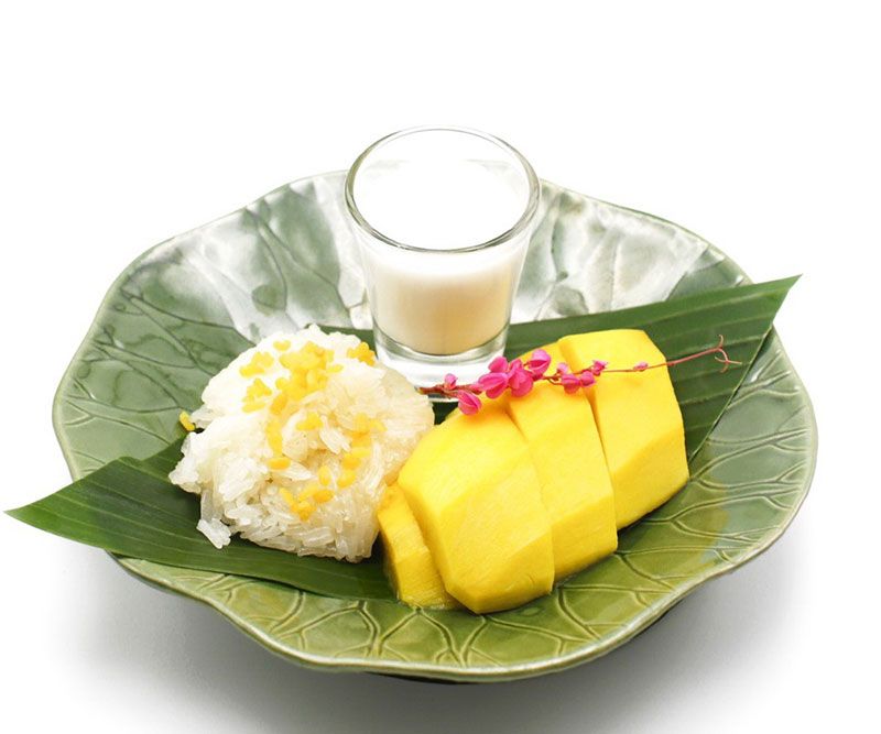 “ข้าวเหนียวมะม่วงอกร่อง” Sweet sticky rice with mango, creamy coconut cream ที่นำข้าวเหนียวเขี้ยวงูไปมูนโดยผสมกับหัวกะทิคั้นสด ใส่เกลือและน้ำตาล รับประทานคู่กับมะม่วงอกร่องสีทอง รสหวาน หอมละมุน ราคา 220++