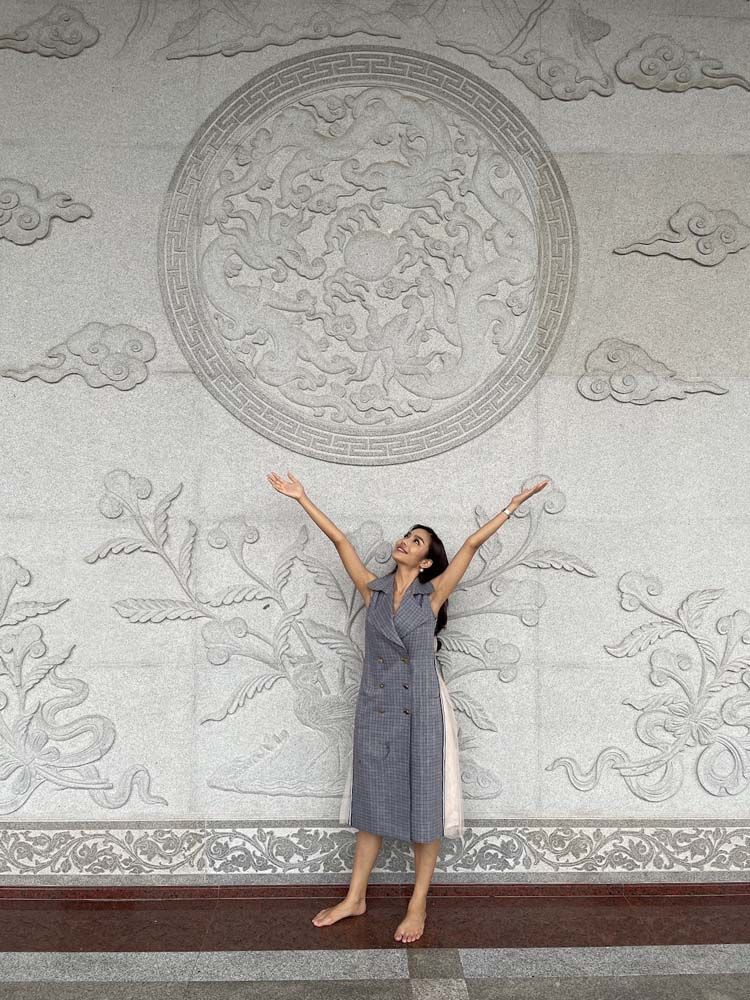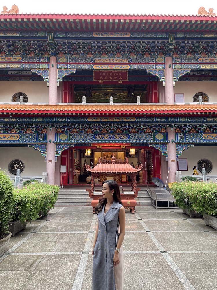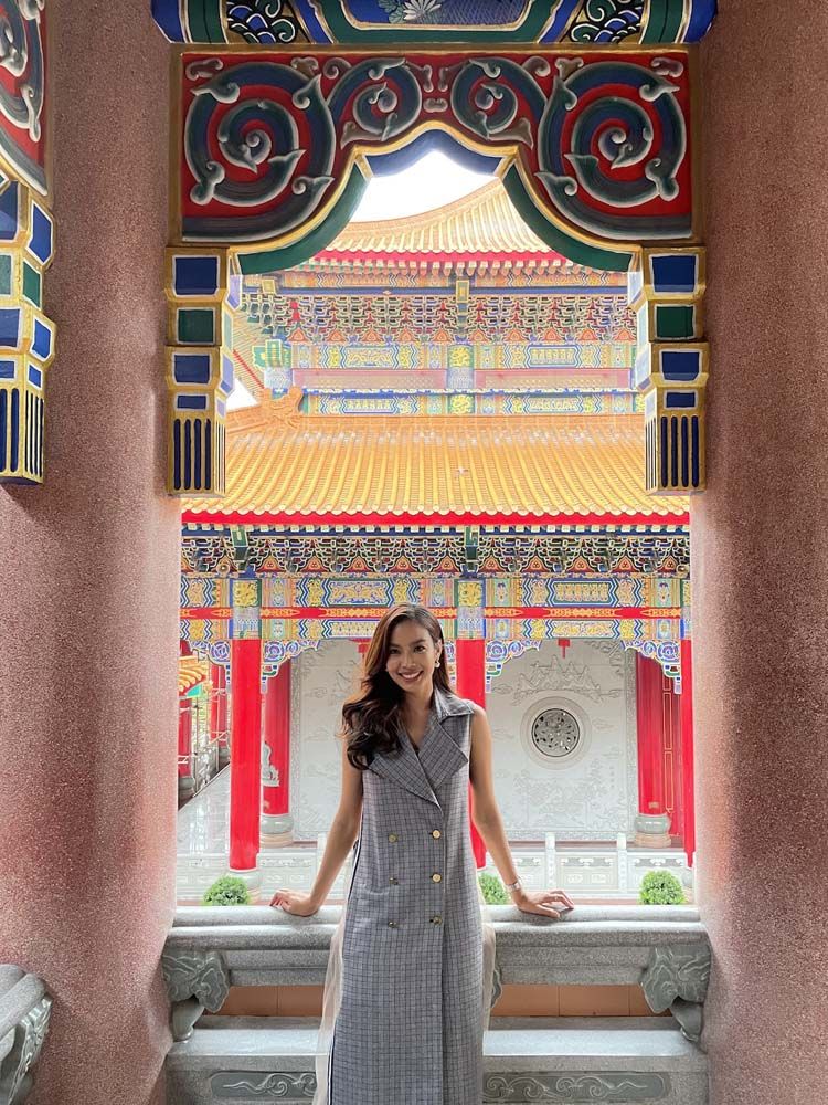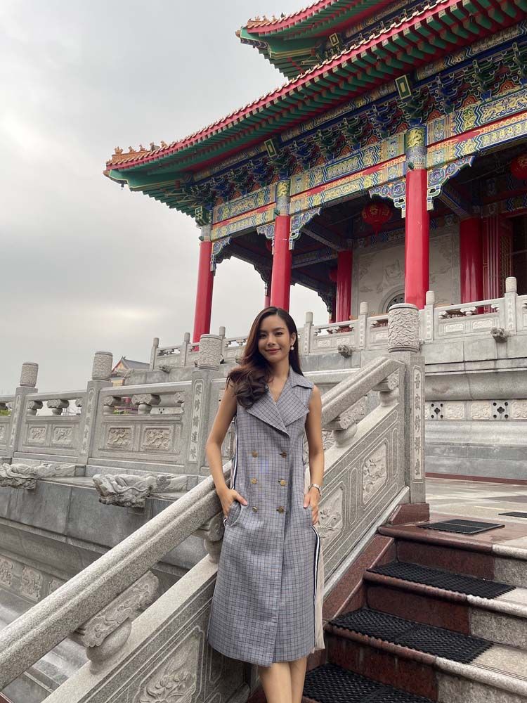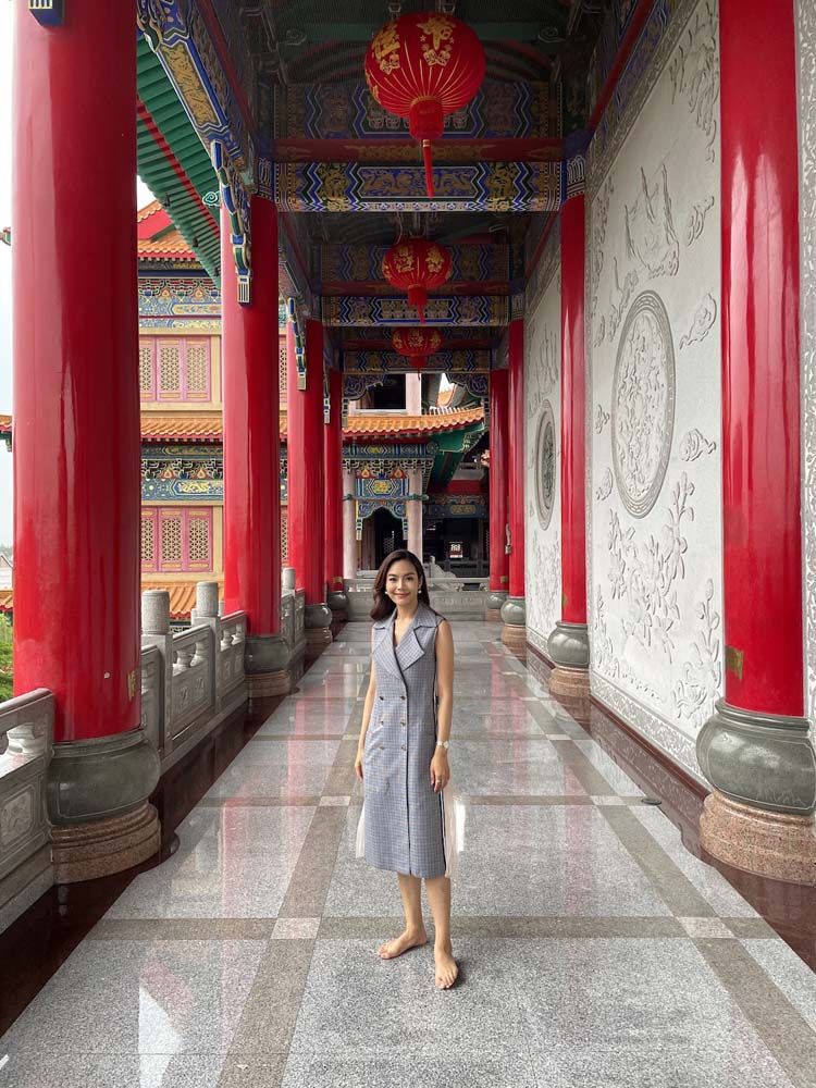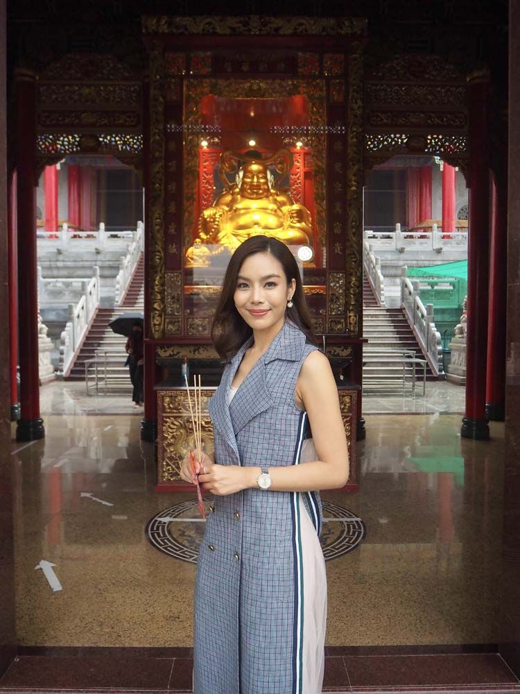 “ครั้งนี้ถือเป็นโอกาสที่ดีที่ได้มาไหว้พระทำบุญ ขอพรสิ่งศักดิ์สิทธิ์ ให้กับตัวเอง และให้กับแฟนคลับทุกคน เพื่อเป็นการเสริมสิริมงคลต้อนรับวันปีใหม่ไทยในปีนี้ด้วยค่ะ บรรยากาศในวันนี้ทำให้นึกถึงตอนที่อยู่ประเทศจีนเลยค่ะ เพราะว่าวัดนี้มีทั้งสถาปัตยกรรมแบบจีนแท้ๆ ที่มีต้นแบบมาจากพระราชวังปักกิ่ง และ ก็ยังมีพระวิหารพระกวนอิมโพธิสัตว์, วิหารหมื่นพุทธเจ้า, วิหารบูรพาจารย์ ที่ช่วยคุ้มครองดวงชะตาช่วยให้ชีวิตรุ่งเรืองราบรื่นตลอดทั้งปีอีกด้วยค่ะ”