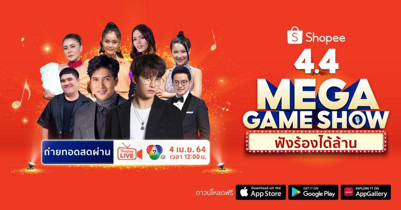 สามารถติดตามชมรายการสดสุดพิเศษ “Shopee4.4 MEGA GAME SHOW ฟังร้องได้ล้าน” ในวันอาทิตย์ที่ 4 เมษายน 2564 เวลา 12.00 น ทางช่อง 7HD หมายเลข 35สามารถติดตามชมรายการสดสุดพิเศษ และดูรายละเอียดเพิ่มเติมได้ที่ https://shopee.co.th/m/mega-game-show