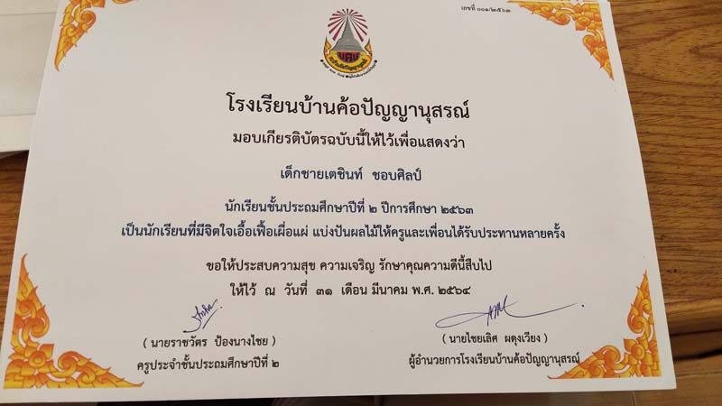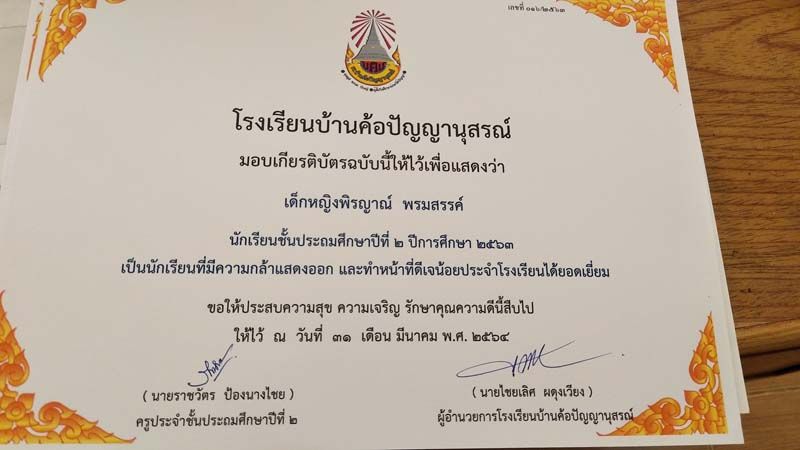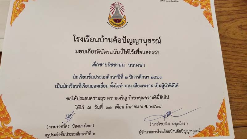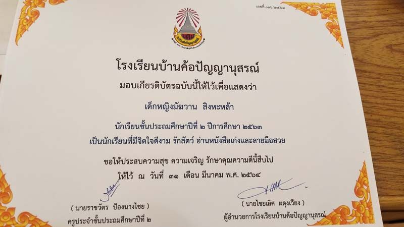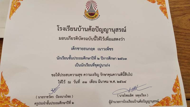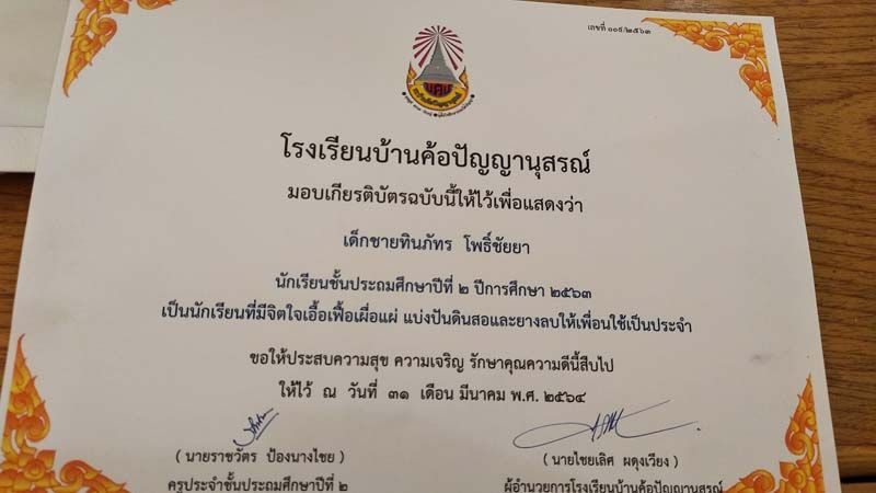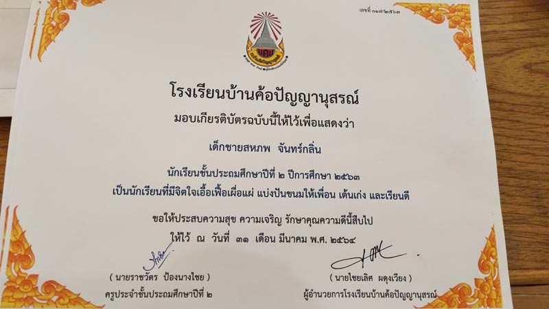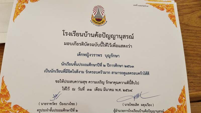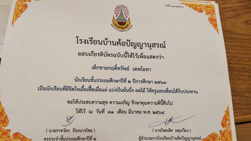 ถือเป็นกำลังใจเล็กๆน้อยๆ ได้เป็นอย่างดี หลังจกาที่เฟซบุ๊ก ราชวัตร ป้องนางไชย ได้โพสต์ภาพมอบเกียรติบัตรให้เด็กนักเรียนชั้น ป.2 โรงเรียนบ้านค้อปัญญานุสรณ์ จ.อุดรธานี ซึ่งในเกียรติบัตรได้ระบุความสามารถและความดีของเด็กๆ อาทิ เป็นนักเรียนที่ขุดปูนาเก่ง , เอื้อเฟื้อเผื่อแผ่ แบ่งปันขนมให้เพื่อน เต้นเก่ง และเรียนดี , ตั้งใจทำงาน เสียงเพราะ เป็นผู้นำที่ดีได้ , รักสัตว์ อ่านหนังสือและลายมือสวย , กล้าแสดงออก และทำหน้าที่ดีเจน้อยประจำโรงเรียนได้ยอดเยี่ยม ฯลฯ