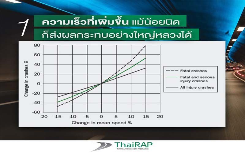 1.ความเร็วที่เพิ่มขึ้นแม้เพียงน้อยนิด ก็ส่งผลกระทบอย่างใหญ่หลวงได้ : การเพิ่มความเร็วเพียง 1% ส่งผลให้การเสียชีวิตจากการชนบนท้องถนน (Fatal Crashes) สูงขึ้น 3.5%-4%