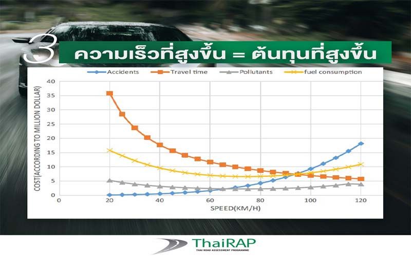 3.ความเร็วที่สูงขึ้น=ต้นทุนที่สูงขึ้น : การใช้ความเร็วที่สูงขึ้นดูเหมือนจะทำให้เวลาในการเดินทาง (Travel Time) ลดลงได้ แต่ต้นทุนด้านอื่น ๆ ก็จะสูงขึ้นตาม ไม่ว่าจะเป็น ความสูญเสียจากการชน (Accidents) การปล่อยมลพิษ (Pollutions) รวมถึงค่าน้ำมันเชื้อเพลิง (Fuel Consumption)
