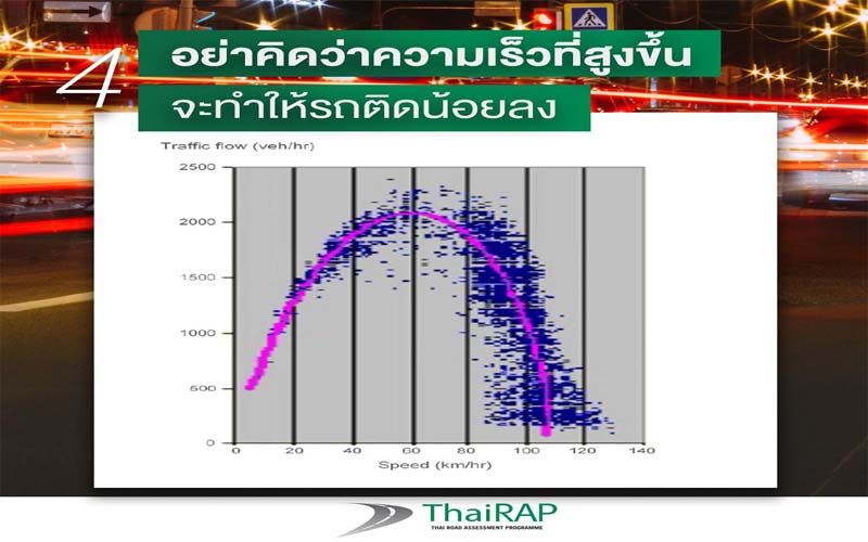 4.อย่าคิดว่าความเร็วที่สูงขึ้นจะทำให้รถติดน้อยลง : เมื่อปริมาณการจราจรสูงถึงจุดอิ่มตัว (จุดสูงสุดของกราฟ) การเพิ่มความเร็ว (Speed) กลับทำให้การไหล (Traffic Flow) ของการจราจรลดน้อยลง ไม่ได้ช่วยให้การจราจรดีขึ้น ซึ่งจากงานวิจัยพบว่า เมื่อรถยนต์ใช้ความเร็วเพิ่มขึ้น ผู้ขับขี่ก็ต้องการระยะห่าง (Gap) ระหว่างรถยนต์เพิ่มขึ้น ทำให้อัตราการไหลลดลง ในบางงานวิจัยยังแสดงให้เห็นว่า ถ้าลดความเร็วลงจะช่วยให้การไหลของการจราจรดีขึ้น ส่งผลให้รถติดน้อยลงด้วย