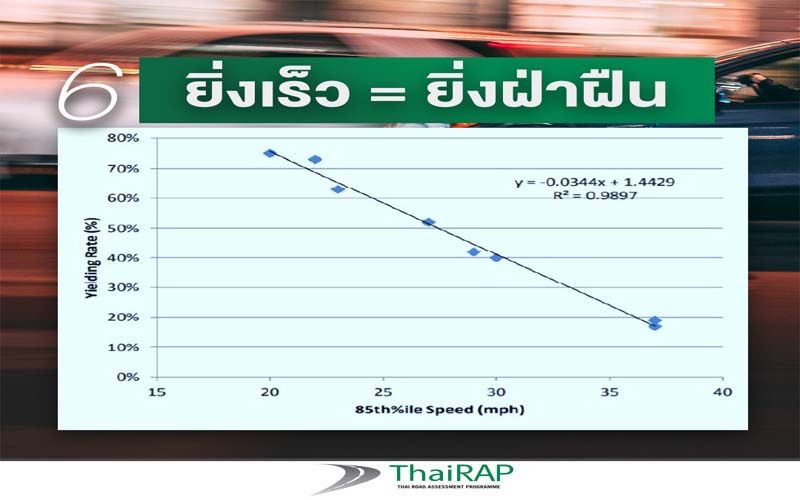 6.ยิ่งเร็ว = ยิ่งฝ่าฝืน : เมื่อผู้ขับขี่ใช้ความเร็ว (85th percentile speed) สูงขึ้น สัดส่วนในการหยุดให้คนข้ามที่ทางข้าม (Yielding rate) ก็ลดลง