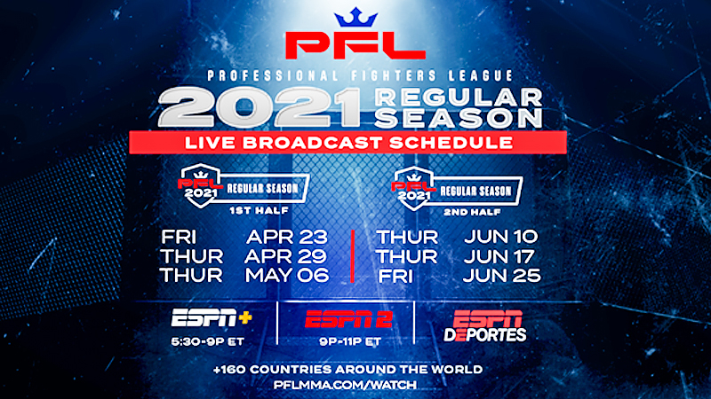 Professional Fighters League (PFL) is the first and only to present MMA in the sports-season format where individual fighters compete in Regular Season, Playoffs, and Championship. PFL is the innovation leader with the PFL SmartCage delivering viewers on-screen fight analytics and real-time prop bets. PFL Roster is second to none with 25% of its fighters ranked in the top 25 in their weight-class. All PFL 2021 Season events are live primetime on ESPN2/ESPN+ in the U.S. and available on leading broadcast and streaming outlets in 160 countries worldwide.
