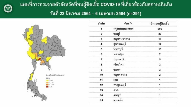 A total of 291 Covid-19 infections had been linked to entertainment venues in and around Bangkok between March 22 and April 6, said the Centre for Covid-19 Situation Administration (CCSA) on Wednesday.