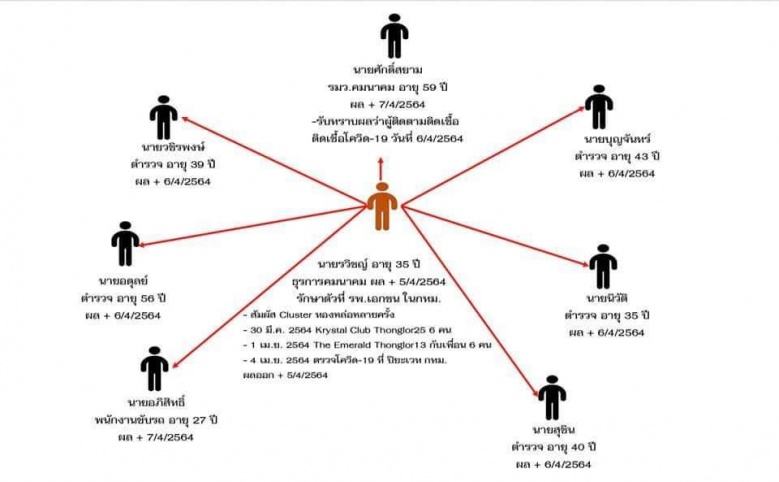 ซึ่งจากการสอบสวนโรคทั้งหมดเกี่ยวข้องกับสถานบันเทิงทองหล่อ จำนวน 6 ราย (โดยตรง) สถานบันเทิง รัชตา จำนวน 2 ราย (โดยตรง) และเป็นกลุ่มเสี่ยงที่ติดต่อจากผู้ที่เดินทางจากสถานบันเทิงทองหล่อ จำนวน 7 ราย