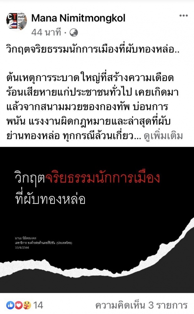 10 เม.ย.64 ดร.มานะ นิมิตรมงคล เลขาธิการองค์กรต่อต้านคอร์รัปชัน (ประเทศไทย) หรือ ACT โพสต์เฟซบุ๊ก Mana Nimitmongkol เรื่อง วิกฤติจริยธรรมนักการเมืองที่ผับทองหล่อ มีเนื้อหาระบุว่า ต้นเหตุการระบาดใหญ่ที่สร้างความเดือดร้อนเสียหายแก่ประชาชนทั่วไป เคยเกิดมาแล้วจากสนามมวยของกองทัพ บ่อนการพนัน แรงงานผิดกฎหมายและล่าสุดที่ผับย่านทองหล่อ ทุกกรณีล้วนเกี่ยวข้องกับการทำผิดกฎหมายและมีพฤติกรรมคอร์รัปชันอยู่เบื้องหลังทั้งสิ้น กรณีผับทองหล่อล่าสุดนี้ได้สร้างความไม่พอให้ประชาชนอย่างมาก เนื่องจากข่าวอันอื้ออึงเซ็งแซ่ว่ามีรัฐมนตรีและนักธุรกิจคณะใหญ่โคจรร่วมกันไปติดโควิดในสถานที่นั้น โดยทุกคนล้วนละเลยไม่ปฏิบัติตามมาตรการควบคุมโรคของรัฐที่เป็นเรื่องคอขาดบาดตายสำหรับประชาชน กลายเป็นว่าการระบาดใหญ่รอบนี้คนที่เป็นรัฐมนตรีนำทีมไปทำเรื่องไม่เหมาะสมเสียเอง เหตุการณ์นี้จึงสะท้อนปัญหา ‘จริยธรรม’ ของนักการเมืองที่เรื้อรัง