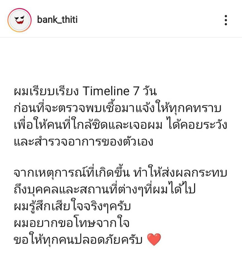 “ผมเรียบเรียง Timeline 7 วัน ก่อนที่จะตรวจพบเชื้อมาแจ้งให้ทุกคนทราบ เพื่อให้คนที่ใกล้ชิดและเจอผม ได้คอยระวัง และสำรวจอาการของตัวเอง จากเหตุการณ์ที่เกิดขึ้น ทำให้ส่งผลกระทบถึงบุคคลและสถานที่ต่างๆ ที่ผมได้ไป ผมรู้สึกเสียใจจริงๆ ครับ ผมอยากขอโทษจากใจ ขอให้ทุกคนปลอดภัยครับ”