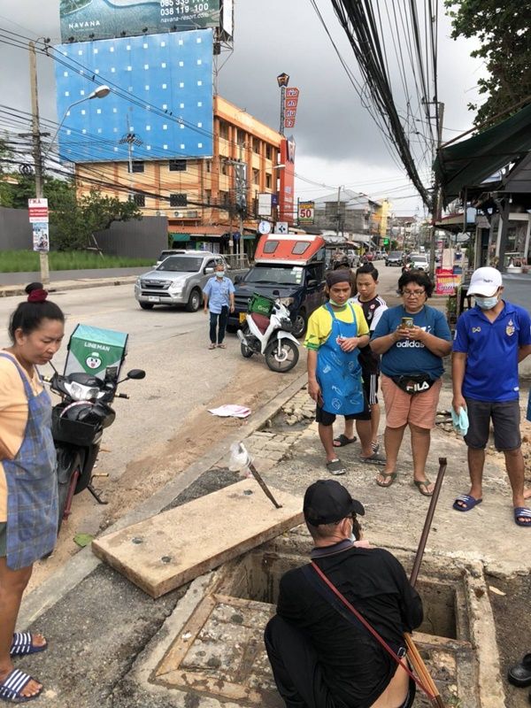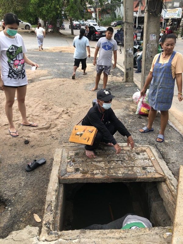สุดซวย! ลุงขายลอตเตอรี่ตาบอดตกท่อระบายน้ำริมถนนเส้นนาเกลือ-เมืองพัทยา