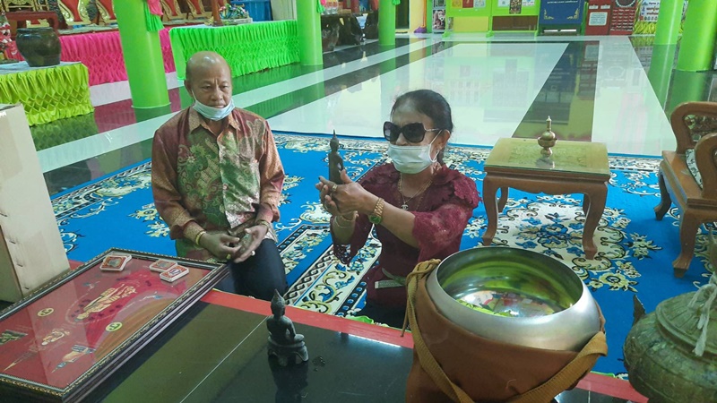ด้านพระมหาอารยนันต์ ได้มอบพระพุทธรูป “หลวงพ่อเกศแหลม” หัวนะโม แหวนหัวนะโม รูปเหมือนและผ้ายันต์ไอ้ไข่ วัดเขาพระทอง ให้กับสองสามีภรรยา ไว้กราบไหว้บูชาเพี่อความเป็นสิริมงคล ก่อนที่สองสามีภรรยาจะเดินทางกลับ