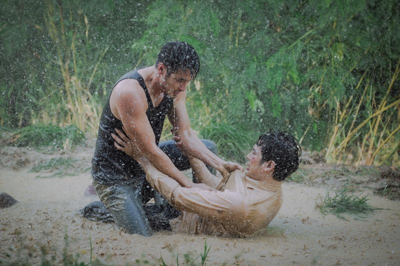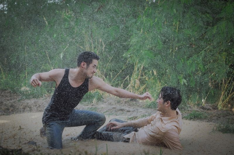 ฉากนี้ถูกเซ็ตขึ้นมา พงหญ้าข้างทางถูกเนรมิตเป็นบ่อโคลนขนาดย่อม พระเอกของเรื่องจะบู๊กันทั้งทีน้อยกว่านี้ไม่ได้ พี่แอ้วจัดมาทั้งฝนทั้งโคลน ตบท้ายด้วยเลือดแบบเน้นๆ เมื่อเตรียมสถานที่พร้อม อุปกรณ์พร็อบพร้อมแล้ว บอยและบอมบ์ต้องใช้เวลาในการซักซ้อมคิวบู๊ แต่ก็ใช้เวลาไม่นาน เพราะพี่แอ้วเลือกที่จะถ่ายเป็นคัท เพื่อความสวยงามของภาพและความปลอดภัยของนักแสดง เมื่อซักซ้อมกันจนรู้คิวดีแล้ว ทั้งบอยและบอมบ์ก็ส่งสัญญาณขอเม็ดฝนทันที ฝน(เทียม)ลงห่าใหญ่ เริ่มจากบอยต้องจับบอมบ์เหวี่ยงลงบ่อโคลน แน่นอนว่าไม่ผ่านในเทคเดียว เพราะบอมบ์นั้นตัวสูงกว่าบอยมาก กว่าบอยจะเอาบอมบ์ลงได้ก็คือ “หอบ!” และเมื่อบอมบ์ลงไปนอนแช่บ่อ ฉากแอคชั่นก็ดำเนินต่อทันที บอยกระโจนเข้าต่อย บอมบ์ก็พยายามปัดป้อง สู้กันไปมาจนโคลนสาดกระจายไปทั่วบริเวณ และแน่นอนว่าใน 1 คัทไม่ได้ถ่ายเทคเดียว แม้ว่าทั้งคู่จะตั้งใจกันแค่ไหน แต่ก็มีอุปสรรคเสมอๆ เช่น น้ำฝนมาไม่ต่อเนื่องบ้าง มุมภาพไม่ได้บ้าง บอมบ์ต้องจมน้ำโคลนไม่รู้กี่รอบในขณะที่บอยเองก็ต้องเลี้ยงอารมณ์ให้ดูโกรธอยู่ตลอดเวลา ก่อนจะถึงคัทสุดท้าย บอมบ์ต้องเติมเลือดปลอม งานนี้ต้องบอกเลยว่าหมดแรง บอมบ์ถึงกับนอนแผ่ในน้ำ ไม่ลุกไปไหน ส่วนบอยเองเนื้อตัวก็เต็มไปด้วยรอยข่วนรอยแดงจากทั้งใบไม้ใบหญ้าและการออกแอคชั่น เรียกได้ว่าสะบักสะบอมกันทั้งคู่ แต่เหล่าคนดูหน้ามอนิเตอร์ยกนิ้วให้และพูดเป็นเสียงเดียวกันว่า “มันส์มาก!!”