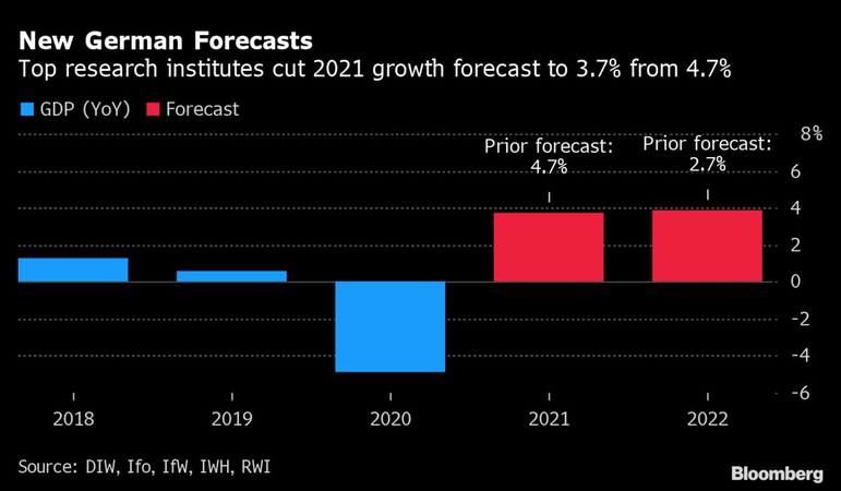 Germany’s leading research institutes cut their joint 2021 growth forecast for Europe’s biggest economy as prolonged lockdowns hold back the nation’s recovery.