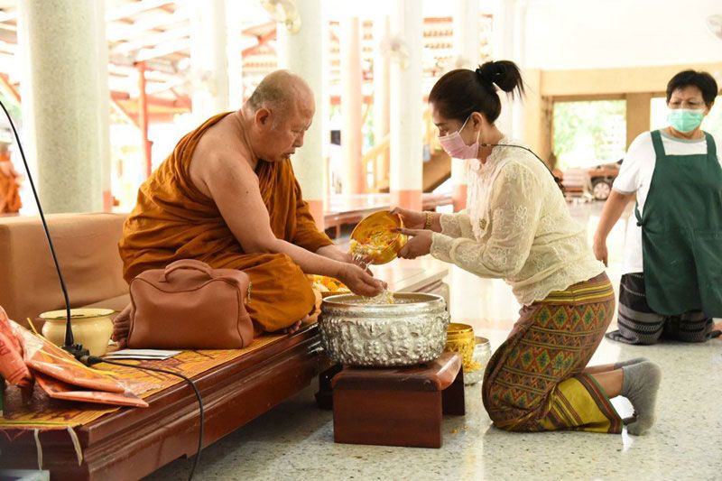 “…ถ้าสงกรานต์เล่นสนุกแล้วติดโรคโควิดก็ไม่สนุกแล้ว ใครได้ติดก็หมดสนุก มีแต่นั่งเศร้าเพราะโรคอันนี้มันร้ายแรงไปทำลายปอด ทำลายระบบทางเดินหายใจ เพราะฉะนั้นก็ให้พวกเราระมัดระวัง การมาอยู่รวมกันก็ให้ระมัดระวัง ใส่แมสทุกครั้ง ล้างมือบ่อยๆ ถ้าเรารักษาเจ้าของ(เจ้าของก็คือตัวเราเอง) รับรองไม่ติดหรอกโควิด วันนี้เรามาทำบุญก็เพื่ออุทิศส่วนกุศลให้พ่อแม่ปู่ย่าตายาย ผู้ที่ล่วงลับดับขันธ์ไปแล้ว ญาติใครญาติมันบอกมารับบุญวันสงกรานต์ และก็ขอให้พวกเจ้ามีความสุขกายสุขใจทุกๆคนเน้อ”