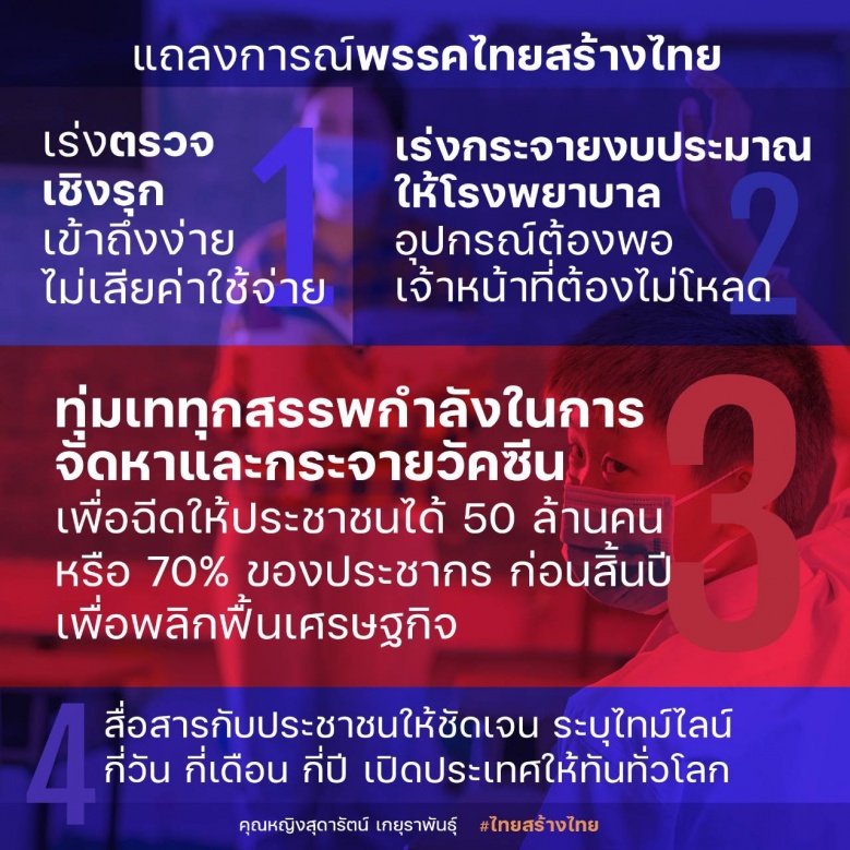 พรรคไทยสร้างไทย จึงขอเสนอให้รัฐบาลเร่งดำเนินการปรับแผนรับมือ COVID-19 เพื่อยุติการแพร่ระบาดให้เร็วที่สุดดังนี้