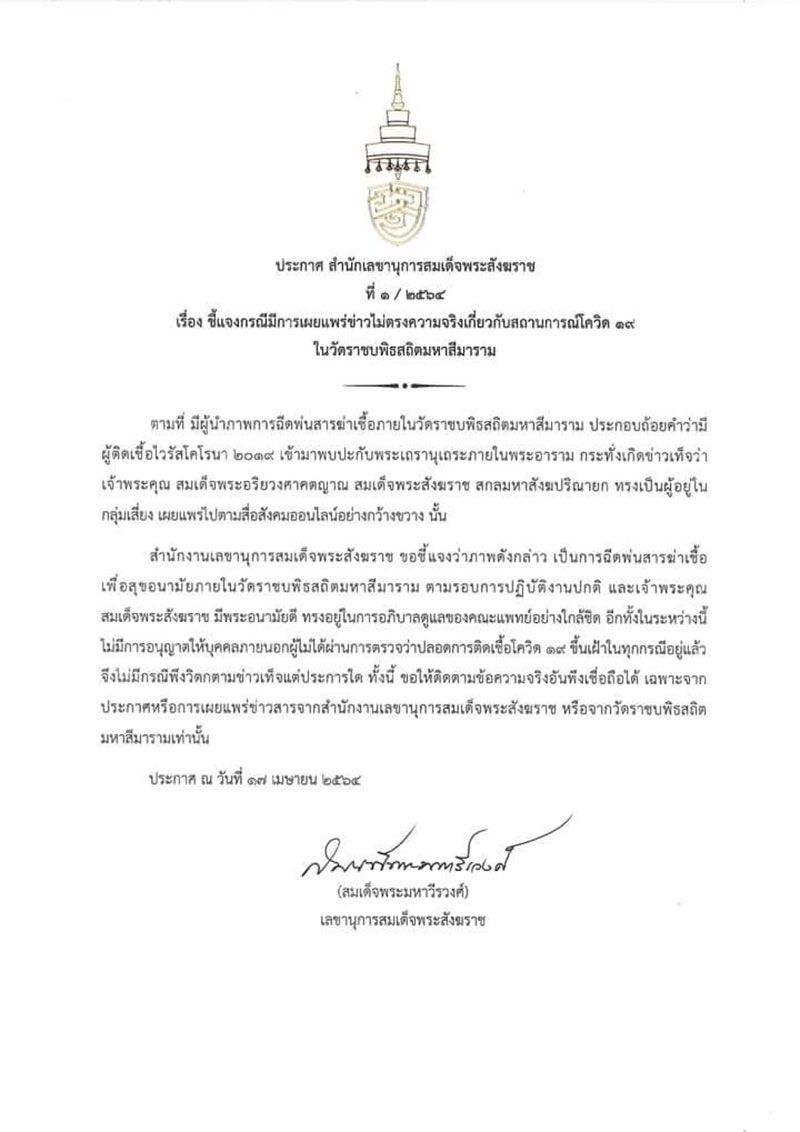 วันที่ 17 เมษายน 2564 เพจเฟซบุ๊ก “สำนักงานเลขานุการสมเด็จพระสังฆราช” โพสต์ประกาศ สำนักงานเลขานุการสมเด็จพระสังฆราช ที่ 1 / 25564 เรื่อง ชี้แจงกรณีมีการเผยแพร่ข่าวไม่ตรงความจริงเกี่ยวกับสถานการณ์โควิด 19 ในวัดราชบพิธสถิตมหาสีมาราม ความว่า