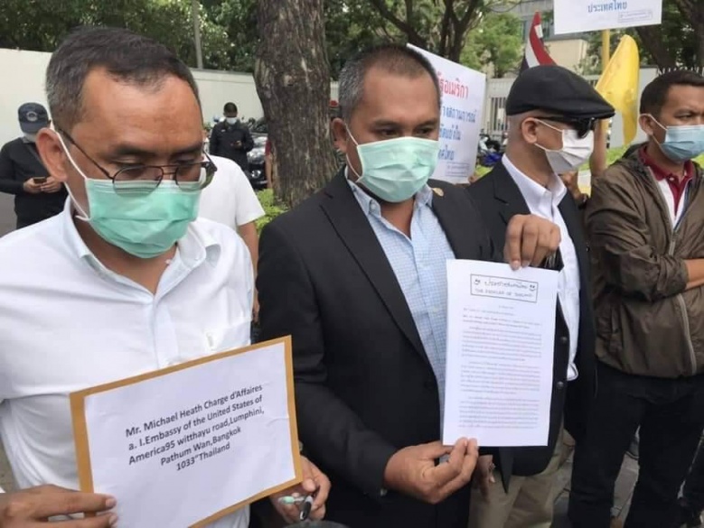 “ทนายนกเขา”พร้อมแนวร่วมกลุ่ม กปปส. เข้ายื่นหนังสือผ่านเจ้าหน้าที่ประจำสถานทูตสหรัฐฯ เพื่อร้องเรียนถึงรัฐบาลสหรัฐอเมริกาให้ยุติการแทรกแซง และบ่อนทำลายความมั่นคงในประเทศไทย